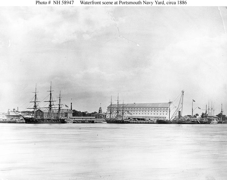 63k | A view of the waterfront at the Portsmouth Navy Yard, Kittery, Maine, circa 1886, with the floating drydock at left. Ships present are (from left to right):