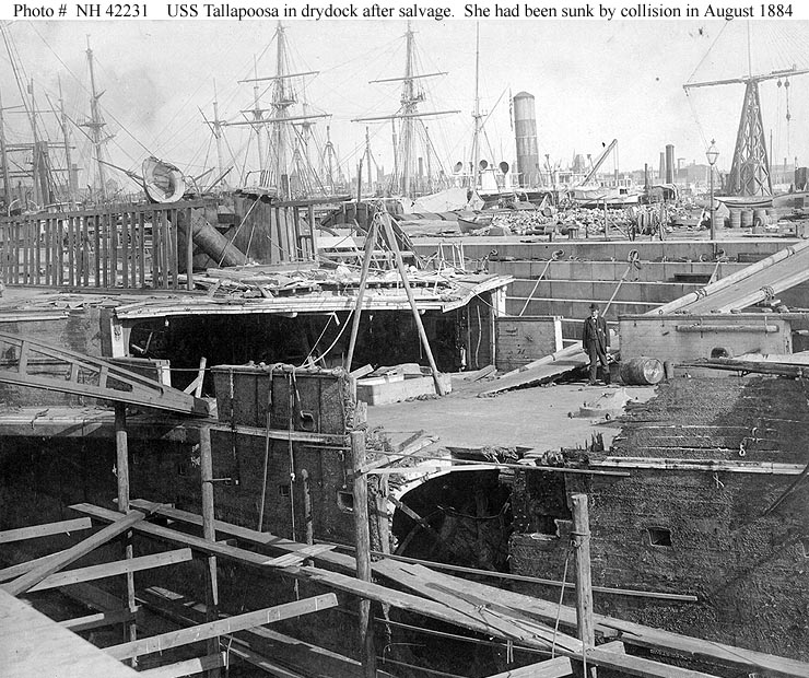 161k | USS Tallapoosa in drydock, probably at the New York Navy Yard in 1884 or 1885, showing damage received, 24 August 1884, when she was sunk in a collision with the schooner James S. Lowell. The view looks toward her starboard side, just forward of the midships superstructure. US Naval History and Heritage Command photo # NH 42231. |