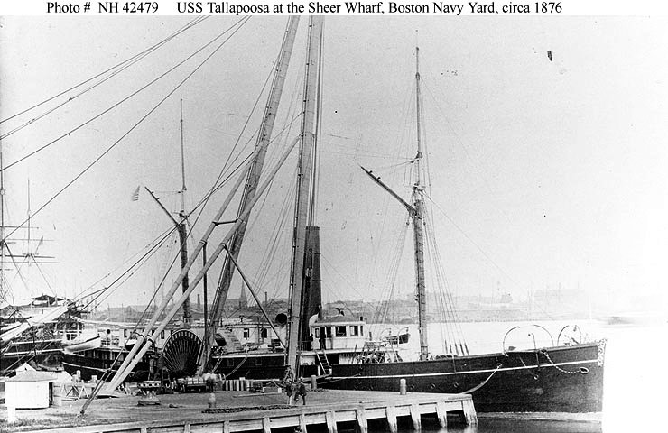 76k | USS Tallapoosa tied up at the Sheer Wharf, Boston Navy Yard, circa 1876, after she was reconstructed. Note the sheer legs on the wharf, and the sterns of USS Wabash and USS Ohio at the left. US Naval History and Heritage Command photo # NH 42479, courtesy of the Naval Historical Foundation. |