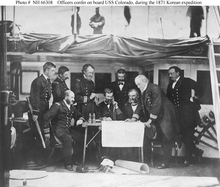 88k | During the Korean Expedition, Rear Admiral John Rodgers, Commanding the Asiatic Fleet, (standing to the right of the table, leaning on the chart) confers with other officers on board his flagship, USS Colorado, during the expedition in June 1871. Other officers present are (seated, left to right):