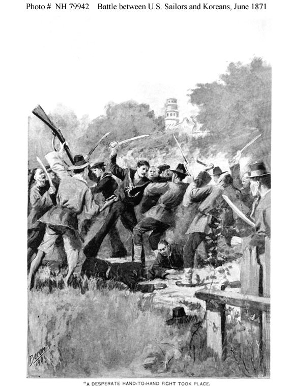 90k | Halftone reproduction of an artwork depicting USS Colorado sailors William F. Lukes, Seth Allen, and Thomas Murphy battling Koreans while trying to rescue the mortally wounded LT. Hugh W. McKee during the capture of the Han River forts, 11 June 1871. Lukes, the only survivor of the US Navy group, received the Medal of Honor for continuing to fight after receiving a head injury. "Deeds of Valor," Volume II, page 89, by the Perrien-Keydel Company, Detroit, 1907. |