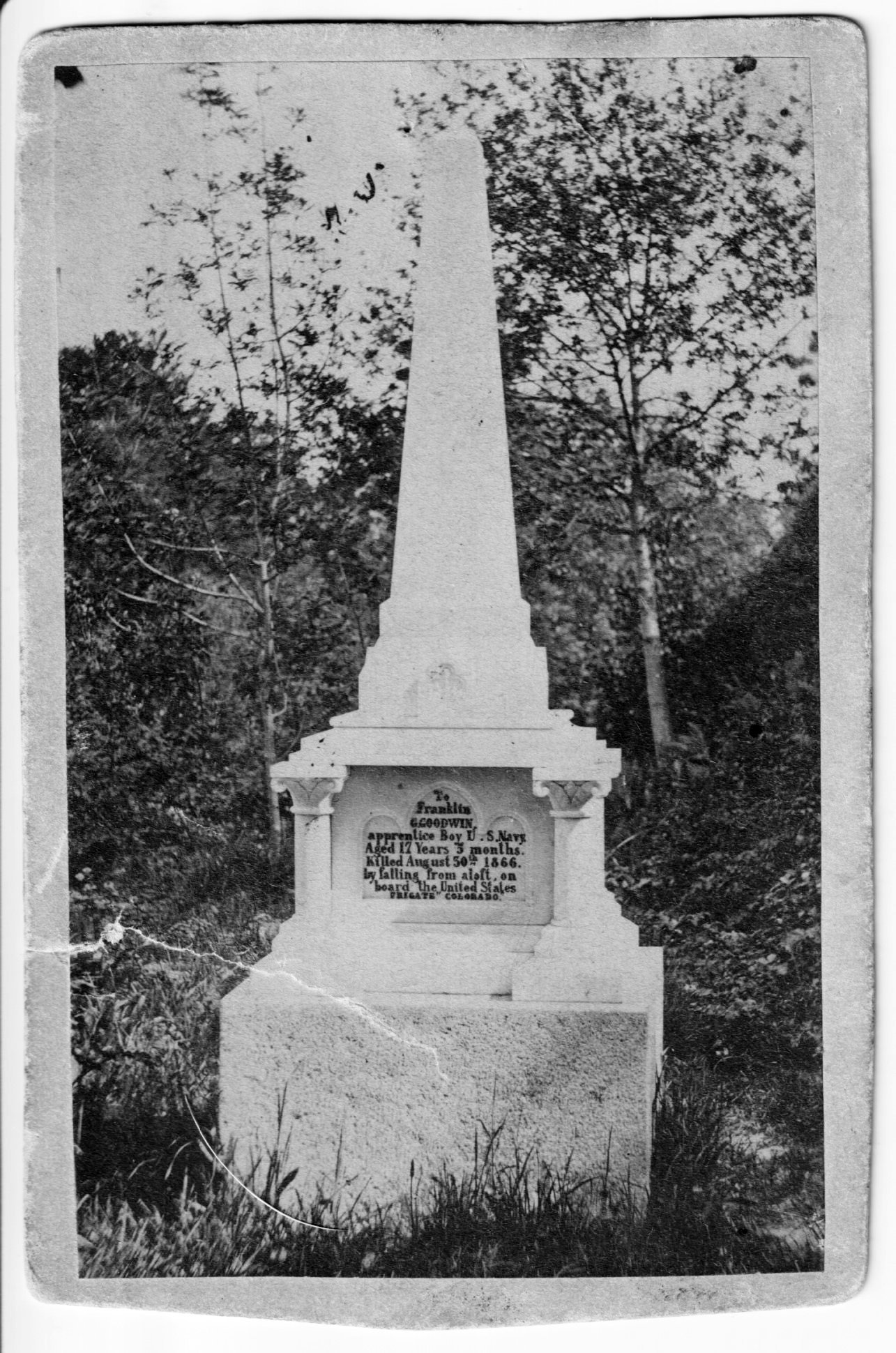 544k | Monument at Cherbourg, France, dedicated to Franklin Goodwin, Apprentice Boy, US Navy, USS Colorado, who died as a result of falling from aloft in August 1866 and subsequently died in hospital at Cherbourg, France. | Nicolas Livory | |
