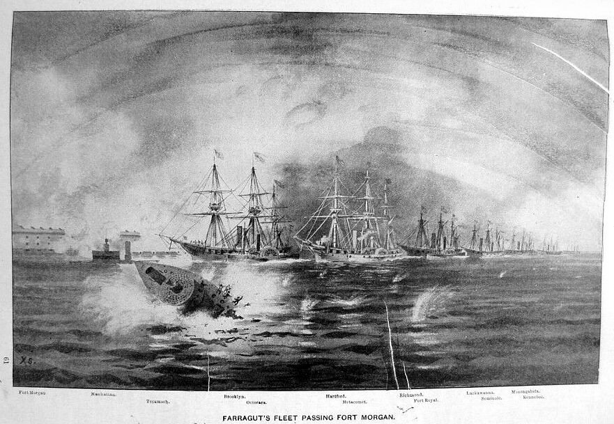 it depicts from left to right); USS Lackawanna, USS Manhattan, USS Octorara, USS Brooklyn, USS Winnebago and USS Richmond. Fort Morgan is shown in the right center distance, and a battery is at the far left US Naval History and Heritage Command photo # NH 59150. |