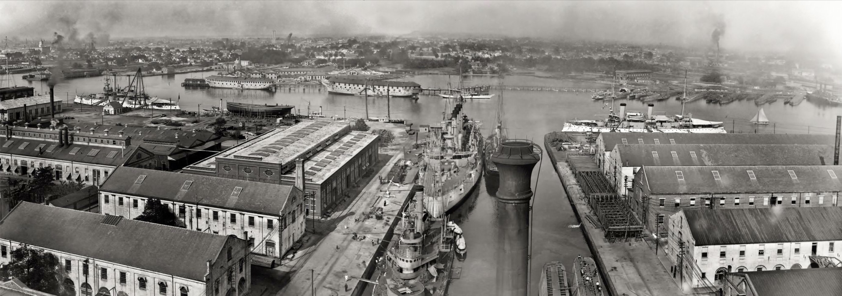 512k | The North end of Norfolk Navy Yard is in foreground; the US Navy Training Ground at Saint Helena, Berkley, Norfolk, VA, is across the Elizabeth River on right. Submarines and torpedo boats are berthed at its angled piers. Moored in the river are the receiving ships USS Franklin and USS Richmond, used to house sailors that were being trained at Saint Helenas. Two white hull pre-WWI battleships are berthed along the quay wall of the Navy Yard, one at Berth 1 (left) adjacent to the masting shear crane and the other at Berth 7 (right). In the center of the photo is Wetslip# 1, with four-stack cruiser (unidentified) at Berth 3. Undated circa 1908. | Brian Baird | |