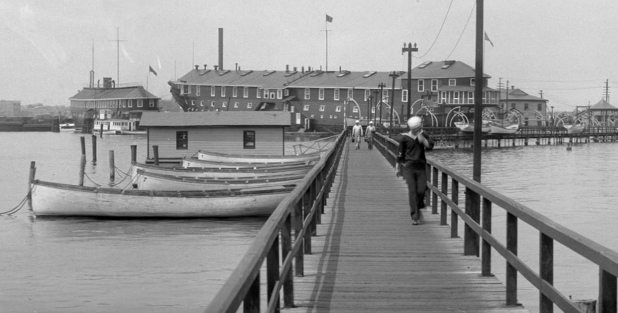 In the background are the Receiving Ships USS Richmond and USS Franklin, across the river at the Saint Helena Annex, the US Navy training ground.