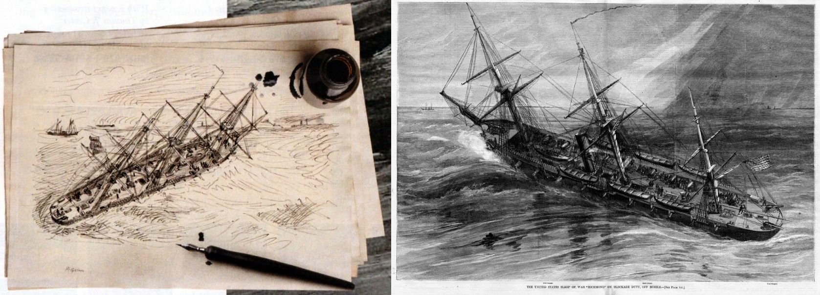 243k | Robert Weir who chronicled with pen and ink life on board USS Richmond, sent many of his sketches to Harper's Weekly where they were refined and published. A reversed rendering of his sketch (left) of the sloop off Mobile Bay appeared in the newspaper seen here as a woodcut engraving titled "The United States Sloop of War [USS] Richmond on Blockade Duty off Mobile.", published in "Harper's Weekly" February, 1864. | Tommy Trampp | |