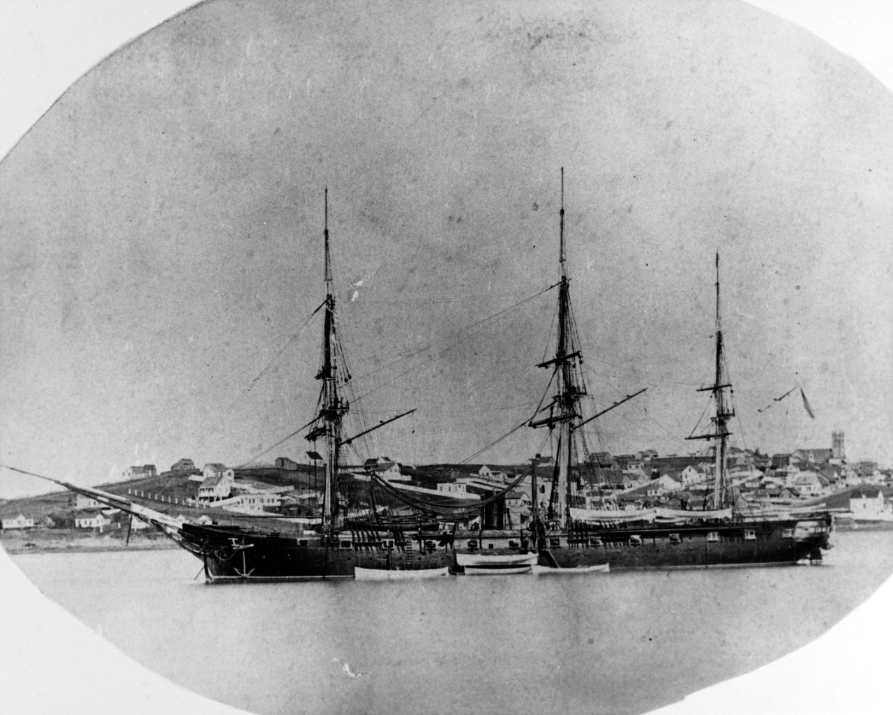 199k | Black and white photo of an oil painting by De Simone of USS Richmond at anchor, probably off Naples, in 1861, with a British Navy Ship-of-the-line at left.