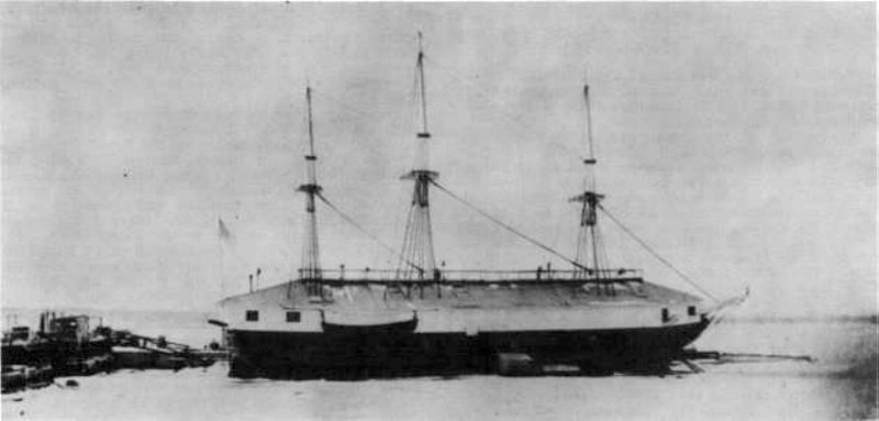 34k | Housed over USS St. Louis serving as a receiving ship at Philadelphia, 1874. Although she has been housed over to provide accommodations, she still retains her masts and the stump of her bowsprit. US Navy photo from DANFS. |