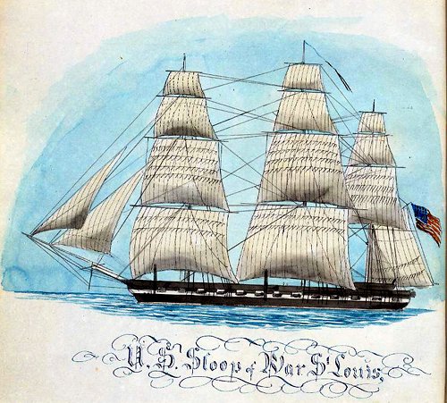 76k | Watercolor of the sloop USS St. Louis by Gunner Moses Lane. Painted between 1852 and 1855 during a cruise in the Mediterranean