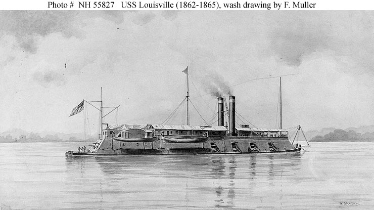 60k | Halftone reproduction of a photograph of USS Louisville on the Western Rivers, during the Civil War. Copied from Francis Trevelyn Miller's "The Photographic History of the Civil War", Volume 6, page 150. US Navy photo # NH 51426 from the collections of the US Naval History and Heritage Command |