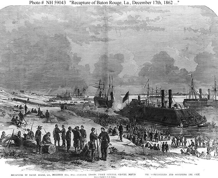 161k | "Recapture of Baton Rouge, La., December 17th, 1862 -- Federal troops under General Grover driving off the Confederates and occupying the city." Line engraving, after a sketch by F. H. Schell, published in "The Soldier in Our Civil War", Volume I. The ironclad gunboat USS Essex is depicted at right, just off shore. US Naval History and Heritage Command photo # NH 59043. |