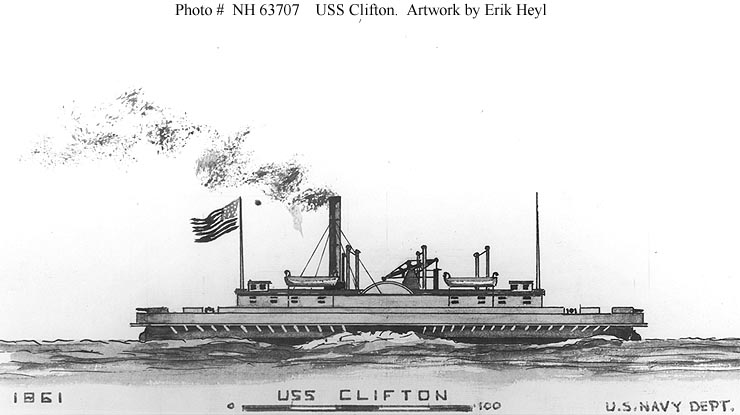 795k | Watercolor by Erik Heyl, 1962, of USS Clifton painted for use in his book "Early American Steamers", Volume IV. She was originally the civilian ferryboat Clifton, built in 1861. After she was captured on 8 September 1863, she became the Confederate gunboat and blockade runner CSS Clifton and was destroyed on 21 March 1864. Watercolor courtesy of Erik Heyl. US Navy photo # NH 63707 from the collections of the US Naval History and Heritage Command |