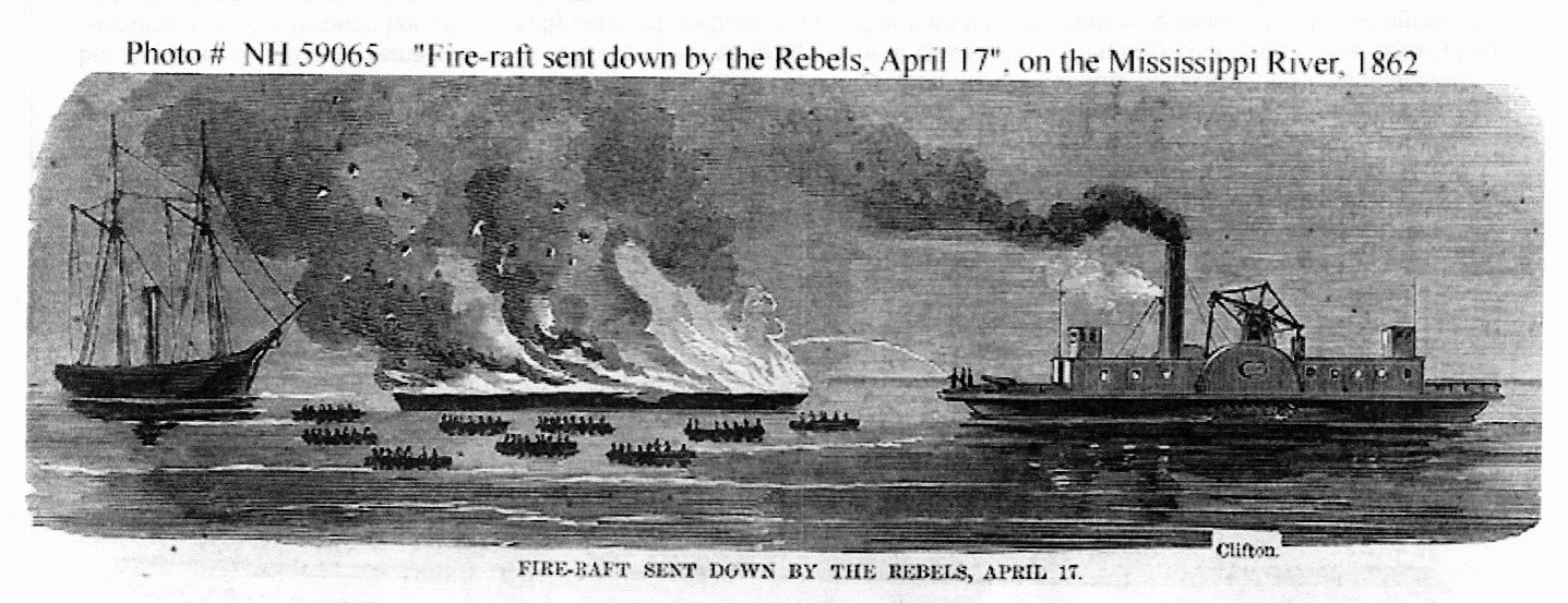 230k | "Fire-raft Sent Down by the Rebels, April 17" A line engraving published in "Harper's Weekly", 1862, depicting USS Clifton playing a fire hose on the Confederate fire raft, as it drifted past Union ships on the lower Mississippi River on 17 April 1862. US Naval History and Heritage Command photo # NH 59065 |