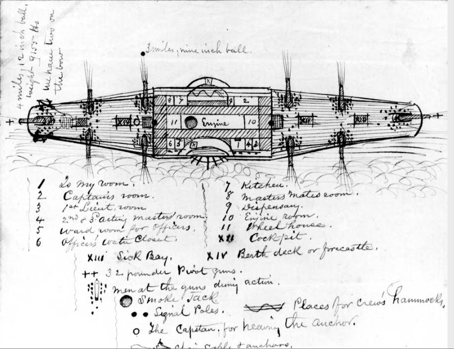 173k | Deck of the USS Clifton in Fighting Order showing a sketch of her gun emplacements and quarters. From Daniel D. T. Nestell Papers housed at the Nimitz Library, United States Naval Academy, Annapolis, MD. |
