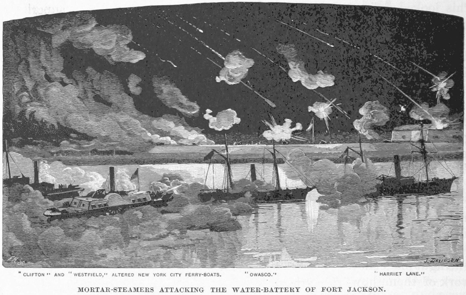 400k | Union mortar steamers bombard Fort Jackson at the Battle of Forts Jackson and St. Philip. From left to right the ships are