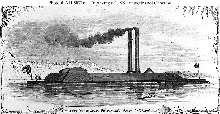 113k | "The Western Iron-clad Gun-boat Ram Choctaw". Line engraving published in Harper's Weekly, 1863. It actually depicts USS Lafayette, not USS Choctaw. US Naval History and Heritage Command Photo # NH 58716 |