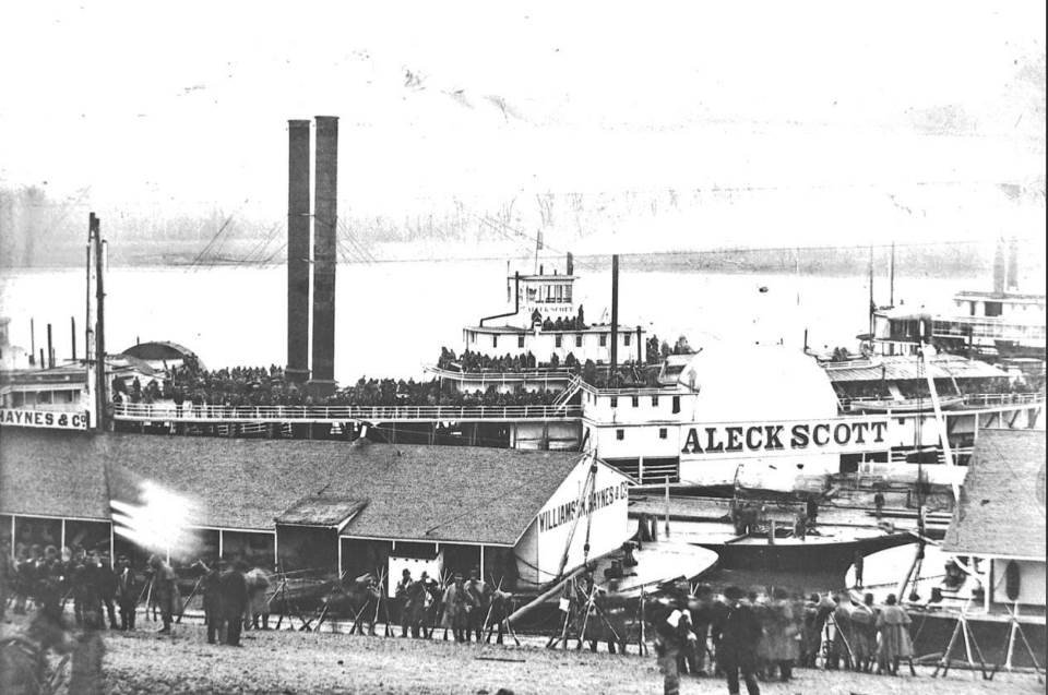 111k | Steamer Aleck Scott tied at a river landing, circa 1848-1861, location unknown.
