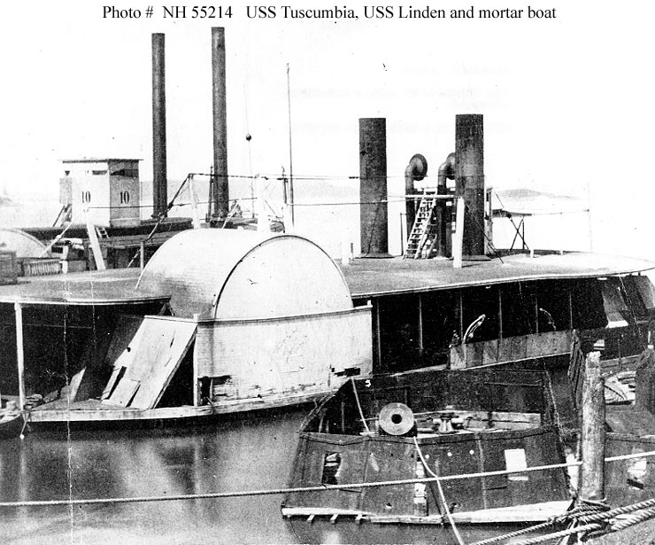 USS Linden ("Tinclad" # 10) is moored outboard of Tuscumbia. Two mortar boats, one with a 13-inch mortar on board, are inboard. Note damage to the rear of Tuscumbia's starboard paddle box. US Navy History and Heritage Command photo # NH 55214. |