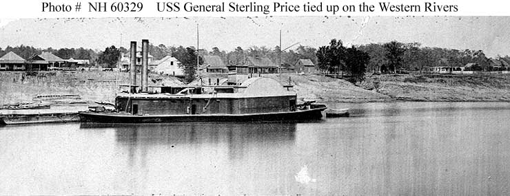 48k | USS General Sterling Price tied up at a Western Rivers settlement, circa 1863-65. US Naval History and Heritage Command photo # NH 60329. |