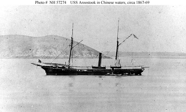 85k | USS Aroostook at anchor in Chinese waters, circa 1867-69. The original print is mounted on a carte de visite, marked "S. Sidney, Photo. China" US Naval History and Heritage Command photo #: NH 57274 from the collection of CAPT. Robert F. Bradford, 1941. |