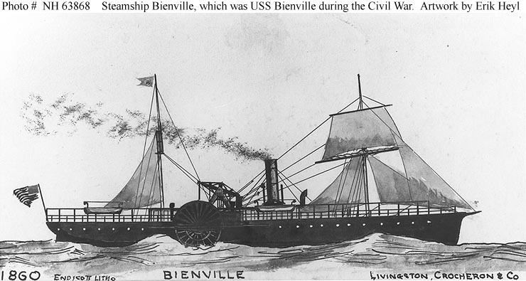 72k | Watercolor by Erik Heyl, 1947, of SS Bienville, painted for use in his book "Early American Steamers", Volume I. Built at Brooklyn, New York, in 1860, this steamer served as USS Bienville in 1861-1867. US Navy photo NH 63868 from the collections of the US Naval History and Heritage Command, courtesy of Erik Heyl. |