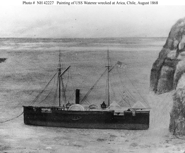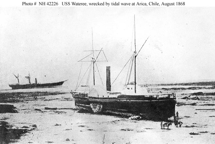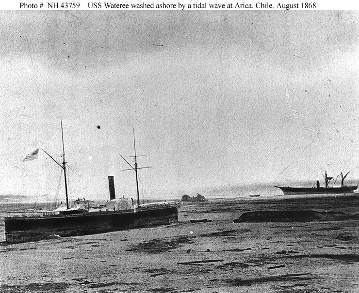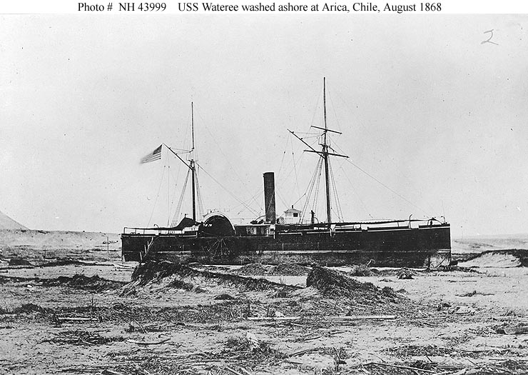 USS Wateree beached at Arica, Chile, after she was washed ashore by a tidal wave on 13 August 1868. Partially dismasted ship stranded in the left distance is the Peruvian warship America.