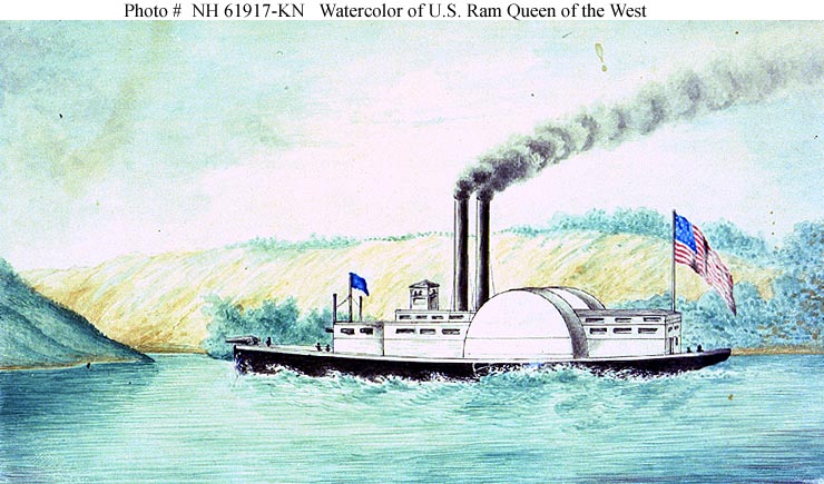 89k | Watercolor, initialed "T.C.R.", of US Ram Queen of the West operating on the Western Rivers during the Civil War. US Naval History and Heritage Command photo # NH 61917-KN, courtesy of the Navy Art Collection, Washington, D.C. |