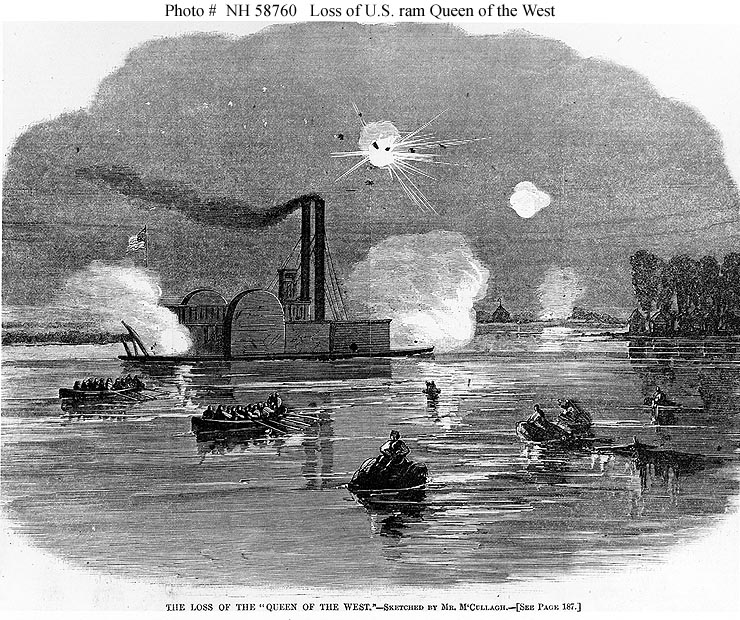 CSS Queen of the West is depicted at the right. Ship was sunk at the head of Palmyra island. Then adjacent to the plantation of Jefferson Davis, and