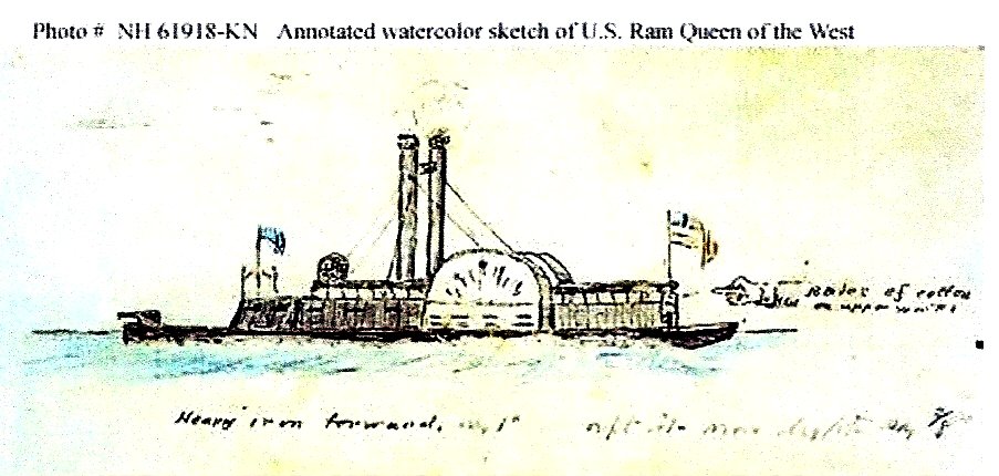 89k | Annotated watercolor sketch of the USS Queen of the West. US Naval History and Heritage Command photo # NH 61918-KN (Color) from the Friends of Fort DuFort DeRussy, Inc. |