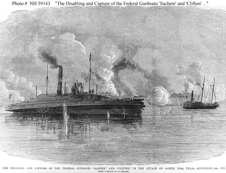 130k | The Disabling and Capture of the Federal Gunboats 'Sachem' and 'Clifton', in the Attack on Sabine Pass, Texas, September 8th, 1863." Line engraving published in "The Soldier in our Civil War", Volume II. USS Clifton is shown to the left, aground and returning fire from the Confederate fortifications. USS Sachem is at the right.