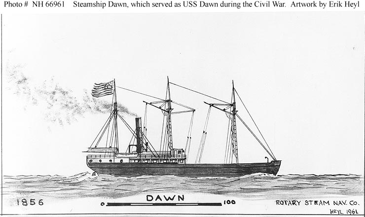 59k | Watercolor by Erik Heyl, of SS Dawn for use in his book "Early American Steamers", Volume III. This vessel served as USS Dawn in 1861-1865 and was later the civilian steamer SS Eutaw. US Naval History and Heritage Command photo # NH 66961 |