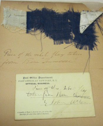 49k | Fragment of the flag from the Confederate Ship CSS Tennessee (1864-1864). This flag was recovered by Ensign John Utter who was acting Ensign onboard during 1864 and became Acting Master shortly afterward. US Navy photo # 2010-83-1 from the Collection of the Curator Branch; Naval History and Heritage Command. |