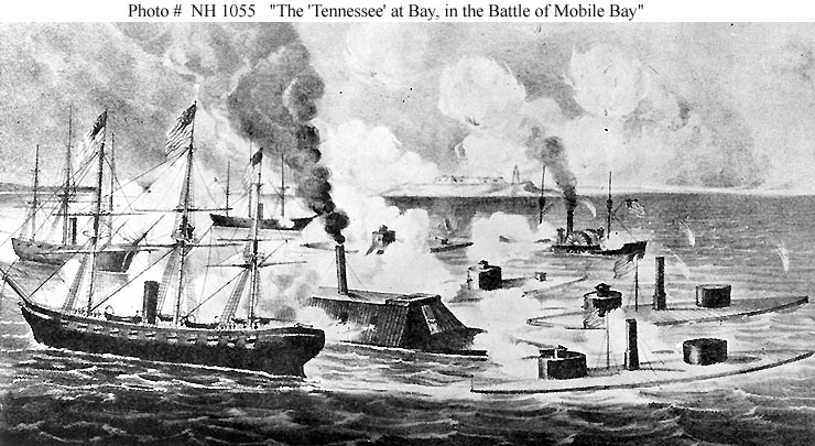 77k | "Battle of Mobile Bay ... Passing Fort Morgan and the Torpedoes". Print after an artwork by J.O. Davidson, 1886, depicting the Union and Confederate squadrons at the moment that USS Tecumseh sank after striking a mine ("torpedo"). Confederate ships (left foreground) are CSS Morgan, CSS Gaines and CSS Tennessee. Union monitors visible astern of USS Tecumseh are USS Manhattan and USS Winnebago. USS Brooklyn is leading the outer line of Union warships, immediately followed by USS Hartford. | US Naval History and Heritage Command photo # NH 42396. Courtesy of President Franklin D. Roosevelt, 1936. | |