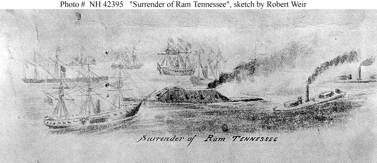 80k | "Surrender of Ram Tennessee". Photograph of a sketch by 3rd Assistant Engineer Robert Weir, of USS Richmond. It depicts CSS Tennessee surrounded by U.S. Navy warships at the conclusion of the Battle of Mobile Bay, 5 August 1864. Ship in the left foreground is USS Hartford. Twin-turret monitors at right are USS Chickasaw and USS Winnebago. US Naval History and Heritage Command Photo # 42395 |