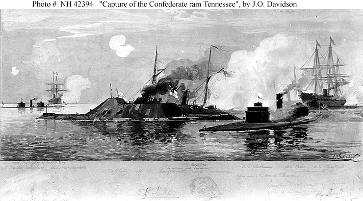 87k | "Capture of the Confederate ram Tennessee" Artwork by J.O. Davidson, depicting the surrender of CSS Tennessee at the conclusion of the Battle of Mobile Bay, 5 August 1864. U.S. Navy ships depicted include monitor USS Winnebago and sloop USS Monongahela, in the left background; sloop USS Ossipee "in collision with Tennessee", in center; monitor USS Chickasaw "lying across the stern of Tennessee", in right foreground; gunboat USS Itasca, in right distance; and flagship USS Hartford further to the right. US Naval History and Heritage Command Photo # 42394 |
