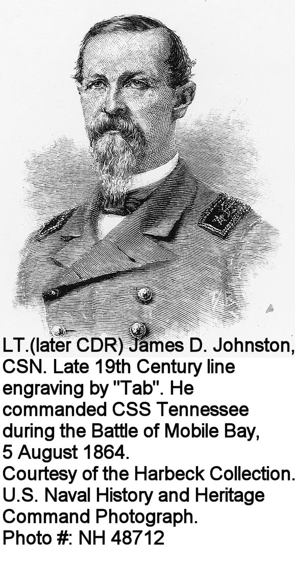 179k | Battle of Mobile Bay, 5 August 1864. Line engraving after an artwork by J.O. Davidson, published in "Battles and Leaders of the Civil War", Volume 4, page 378. Entitled "Surrender of the Tennessee, Battle of Mobile Bay", it depicts CSS Tennessee in the center foreground, surrounded by the Union warships (from left to right): USS Lackawanna, USS Winnebago, USS Ossipee, USS Brooklyn, USS Itasca, USS Richmond, USS Hartford and USS Chickasaw. Fort Morgan is shown in the right distance. | US Naval History and Heritage Command photo # NH 1276 Courtesy of the U.S. Naval Academy Museum, Annapolis, Maryland. Gift of Henry Huddleston Rogers, 1930. | |