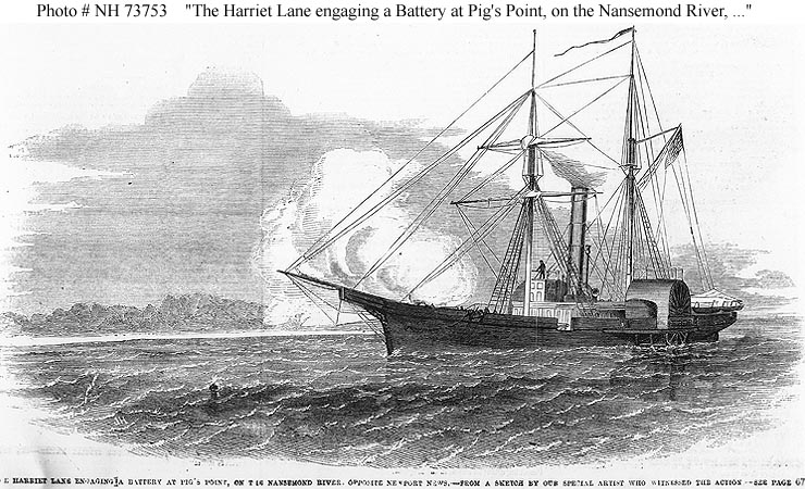 120k | Engraving, published in "Frank Leslie's Illustrated Newspaper", 1861, depicting USS Harriet Lane engaging a Confederate battery at Pig's Point, on the Nansemond River opposite Newport News, VA., 5 June 1861. US Naval History and Heritage Command photo # NH 73753. |