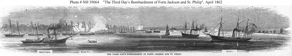 Mississippi River, 20 April 1862. Ships in the foreground are USS Harriet Lane (left) and USS Oneida (right).
