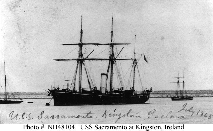 67k | USS Sacramento at Kingstown, Ireland, in July 1865. Several local sailing vessels are nearby. This photograph shows Sacramento in her original configuration, with no bowsprit. US Navy photo # NH 57513 |