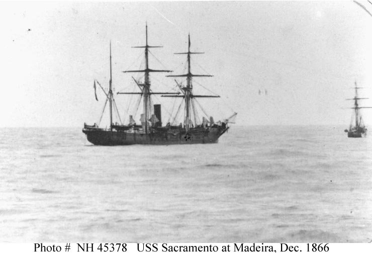 51k | USS Sacramento in quarantine at Madeira in December 1866, while en route to the East Indies station by way of west Africa. Photo from the collection of Surgeon H.P. Babcock, USN; donated by his son, George R. Babcock, 1939. US Navy photo # NH 45378 |