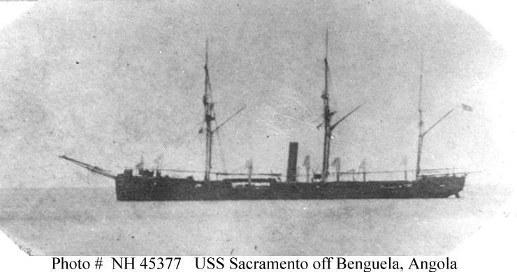 45k | USS Sacramento at Benguela, Angola, off Elephant's Bay, 7 March 1867, while cruising along the west African coast en route to