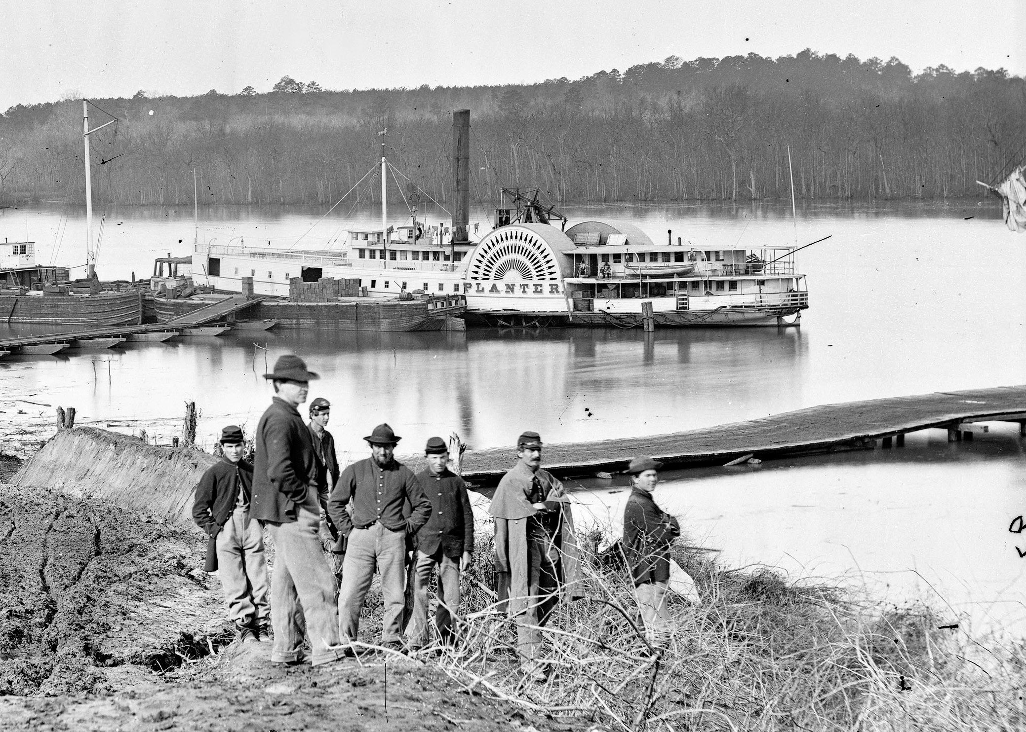 US Army steamer Planter (center) with another steamer, a schooner and several barges, at a small landing, during the Civil War