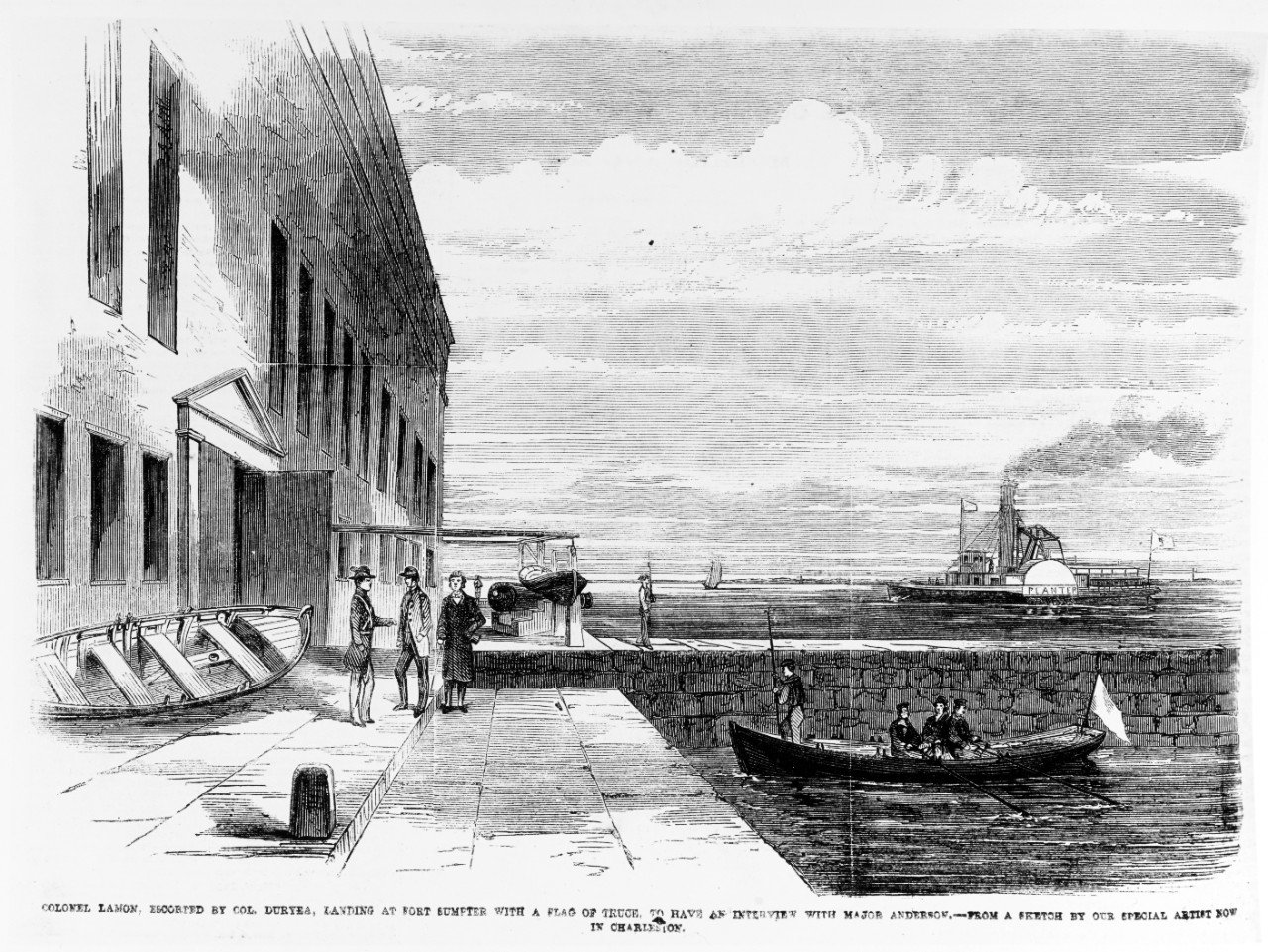 Colonel Lamon, escorted by Col. Duryea, landing at Fort Sumter with a flag of truce to have an interview with Major Anderson in early 1861.