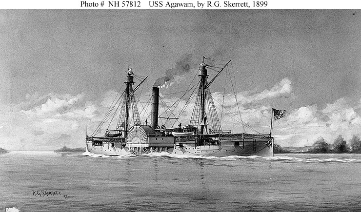 Sepia wash drawing by R.G. Skerrett, 1899, depicting USS Agawam (I) underway, during 1864-1865. US Naval History and Heritage Command photo # NH 57812 |