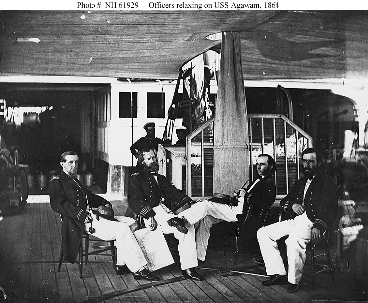 Some of USS Agawam (I)'s officers relaxing on deck, while she was serving on the James River, VA. in the summer of 1864. They are (from left to right): Assistant Paymaster H. Melville Hanna; CDR. Alexander C. Rhind, Commanding Officer; Assistant Surgeon Herman P. Babcock; and LT George Dewey. Note awning overhead, and windsail rigged for ventilation of the spaces below decks. Photo courtesy of the Library of Congress.