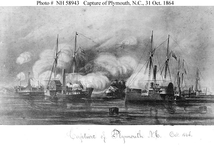 USS Wyalusing in engaging Confederate batteries at Plymouth, North Carolina, 31 October 1864. Small vessels lashed to the gunboats' unengaged sides include