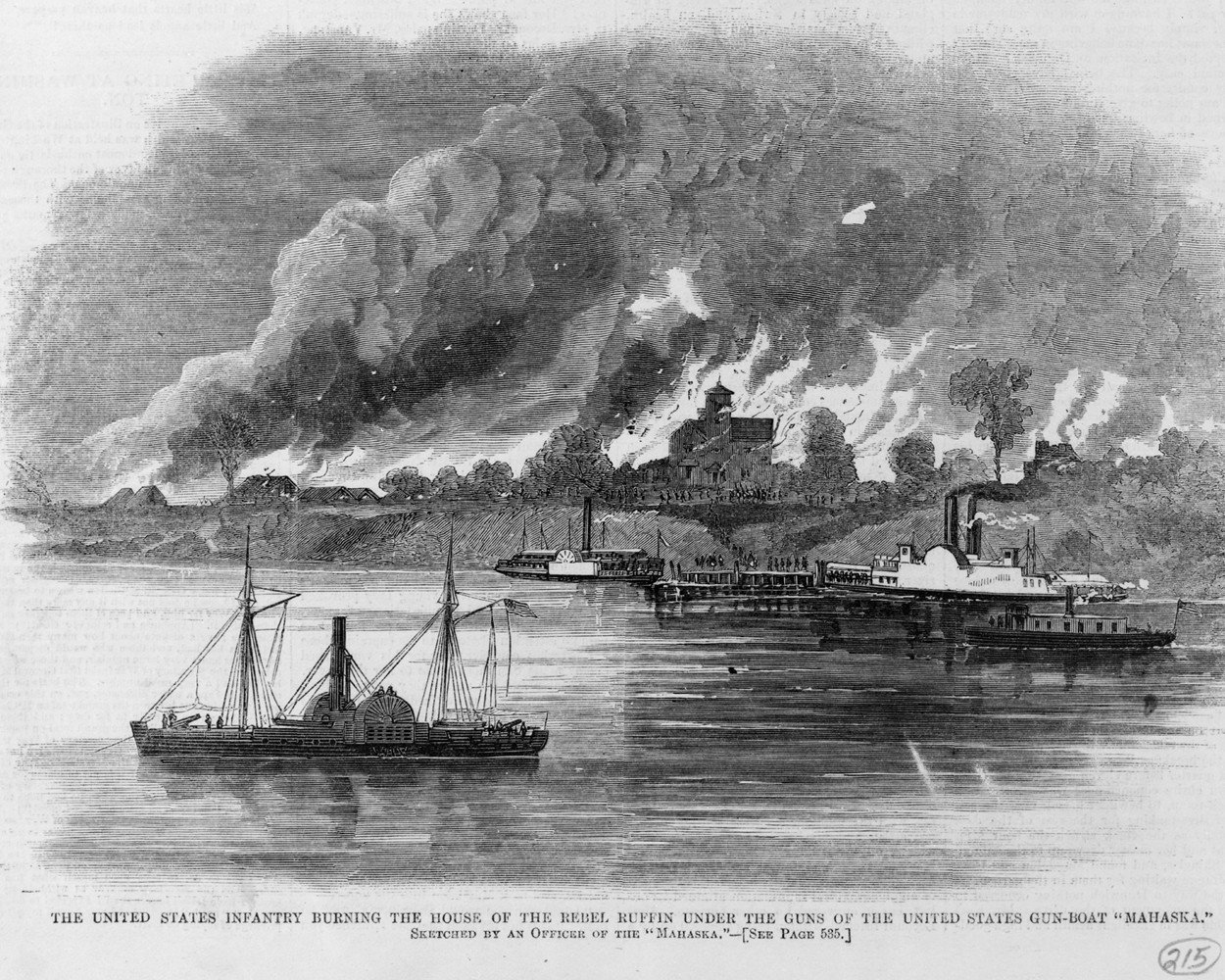406k | "The United States Infantry burning the House of the Rebel Ruffin under the Guns of the United States Gunboat 'Mahaska'"
