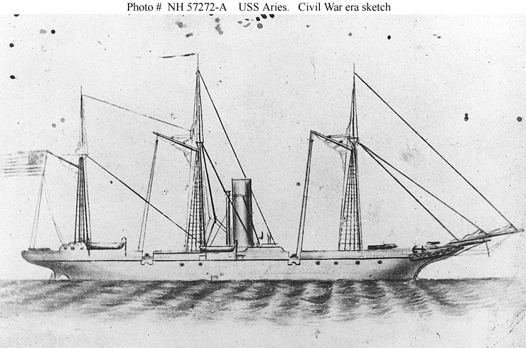 85k | Photographic reproduction of contemporary sketch, mounted on a carte de visite of USS Aries from the collection of Assistant Engineer R.C. Potts. Donated by his daughter, Mrs. Noble Newport Potts, 1945. US Naval History and Heritage Command photo # NH 57272-A |