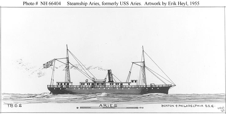 43k | Artwork by Erik Heyl, 1955, for use in his book "Early American Steamers", Volume III. It depicts USS Aries as she appeared in merchant service after the Civil War.