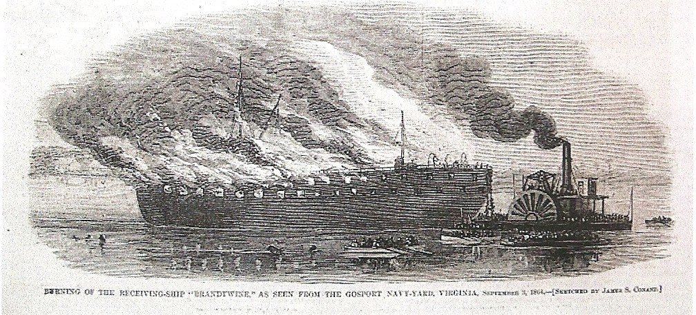 233k | Engraving of USS Brandywine on fire in the Gosport Navy Yard, 3 September 1864. Sketched by James S. Conant for Harper's Weekly 1864. | Tommy Trampp | |